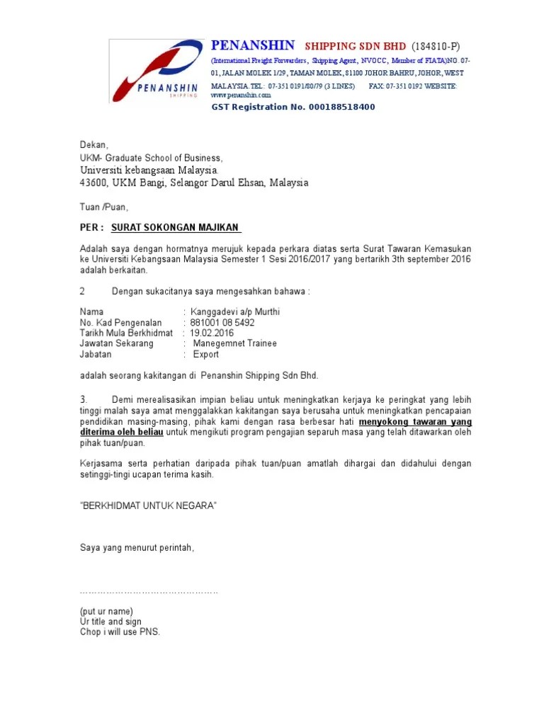 Contoh surat sokongan majikan yang menyokong tawaran belajar (admin tidak bertanggungjawab atas sebarang kesilapan atau kesalahan ejaan atau tatabahasa. Contoh surat sokongan majikan yang menyokong tawaran belajar (admin tidak bertanggungjawab atas sebarang kesilapan atau. Download contoh surat sokongan majikan untuk sambung belajar download document. Contoh surat sokongan majikan yang menyokong tawaran belajar (admin tidak bertanggungjawab atas. Contoh surat akuan majikan sambung belajar tahukah anda bahawa anda perlu memohon surat pengesahan confirmation daripada pihak majikan sebagai . Ia juga boleh dijadikan surat sokongan untuk sambung belajar peringkat sarjana jika sesebuah universiti itu memerlukan pengesahan majikan anda.